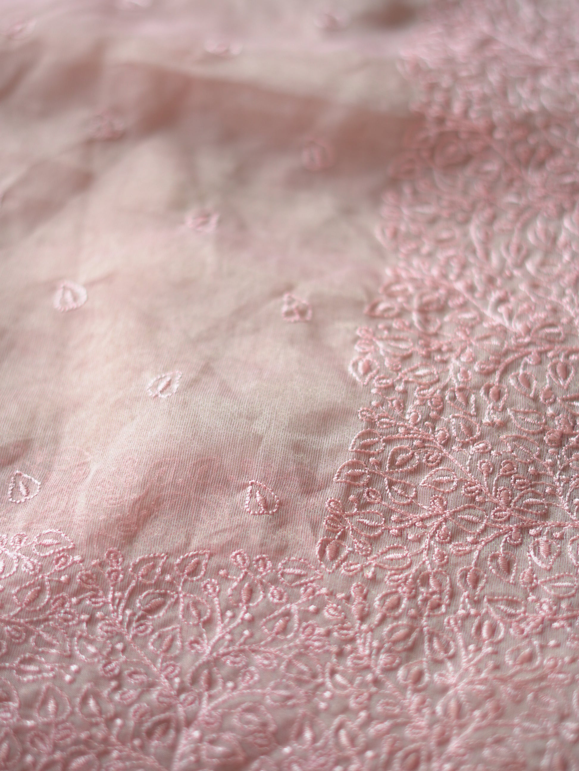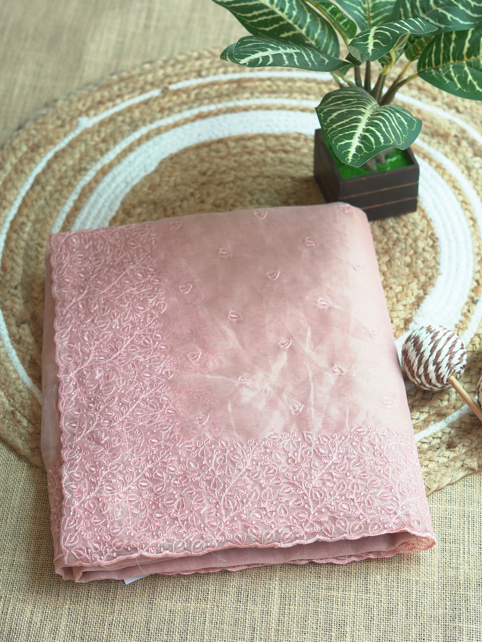This soft baby pink organza saree is adorned with intricate thread embroidery, creating a beautifully feminine and graceful look. The lightweight organza fabric drapes effortlessly, offering comfort along with a premium feel. Delicate embroidered patterns along the borders add an elegant finish, making this saree perfect for celebrations, functions, and special occasions where you want a subtle yet charming style.