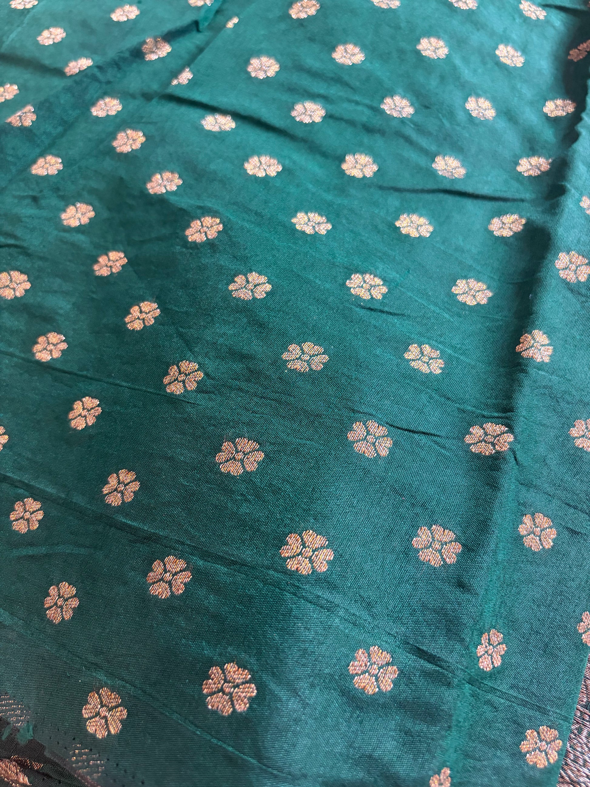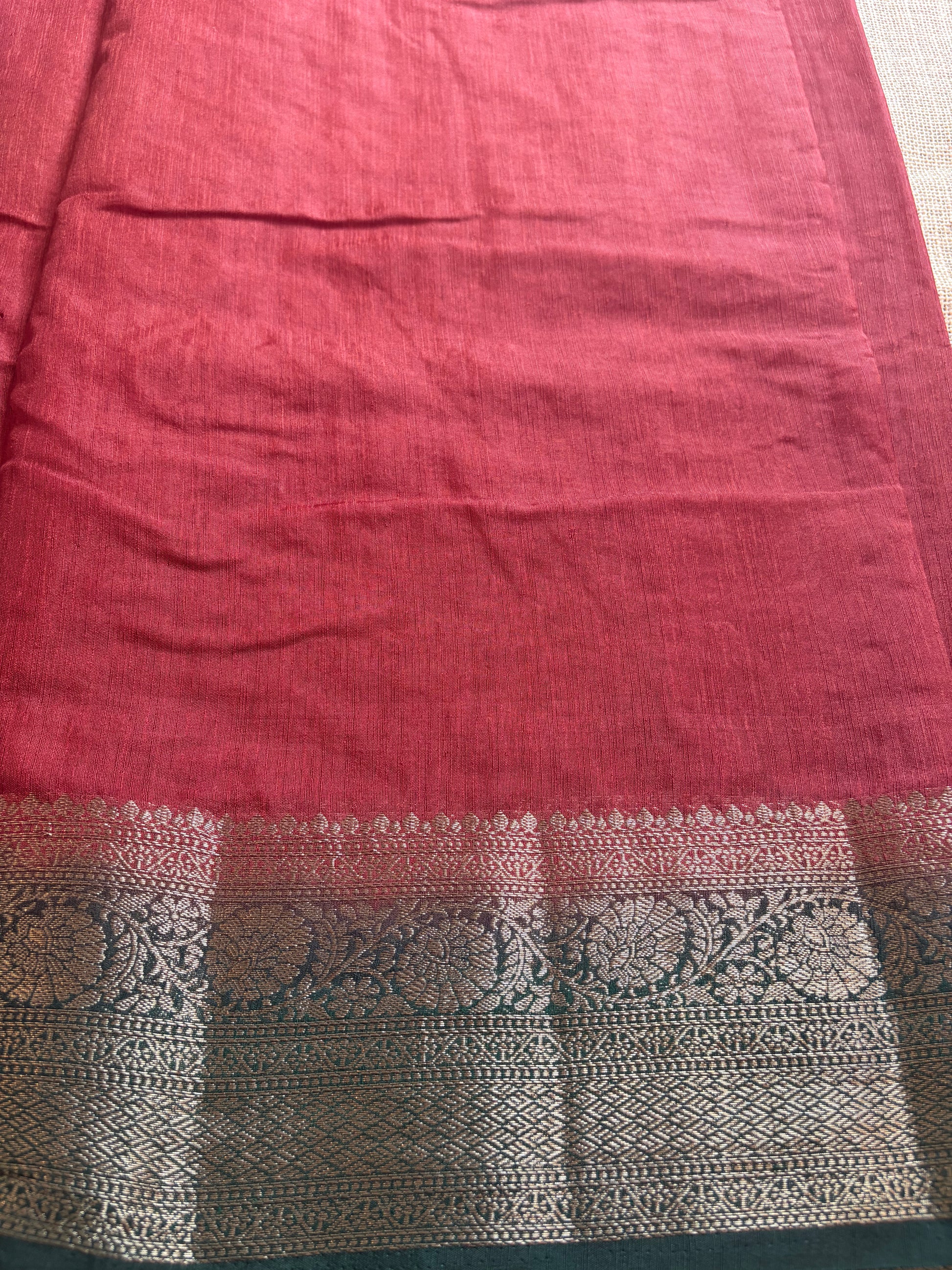 This elegant maroon semi jute silk saree is beautifully enhanced with a contrasting green border that adds a classic traditional touch. The rich maroon body paired with the vibrant green border creates a striking and timeless colour combination. Crafted from lightweight semi jute silk, the saree drapes gracefully while offering comfort and a subtle natural sheen. Perfect for festive occasions, weddings, and special gatherings, this saree blends tradition, elegance, and refined craftsmanship.