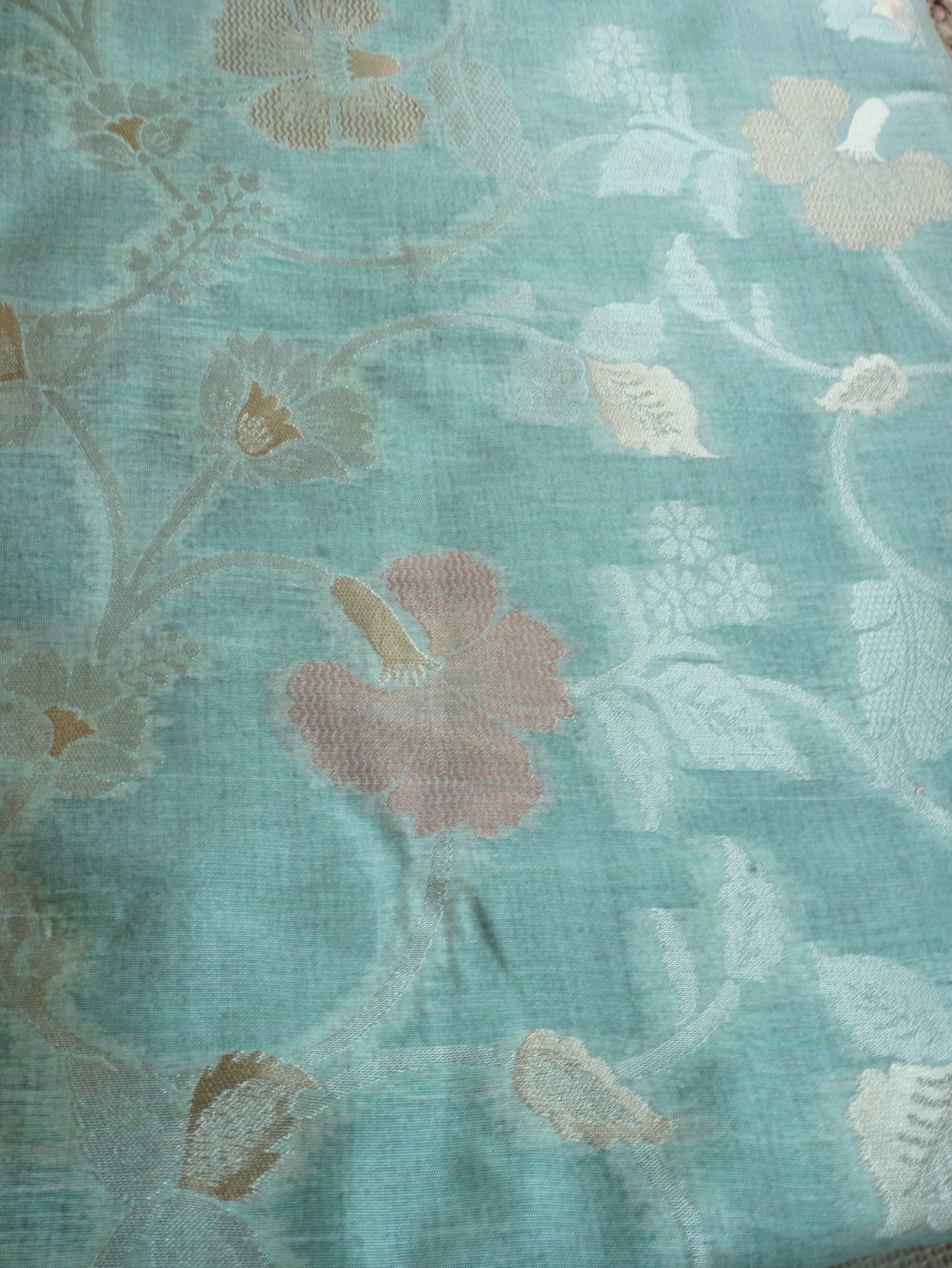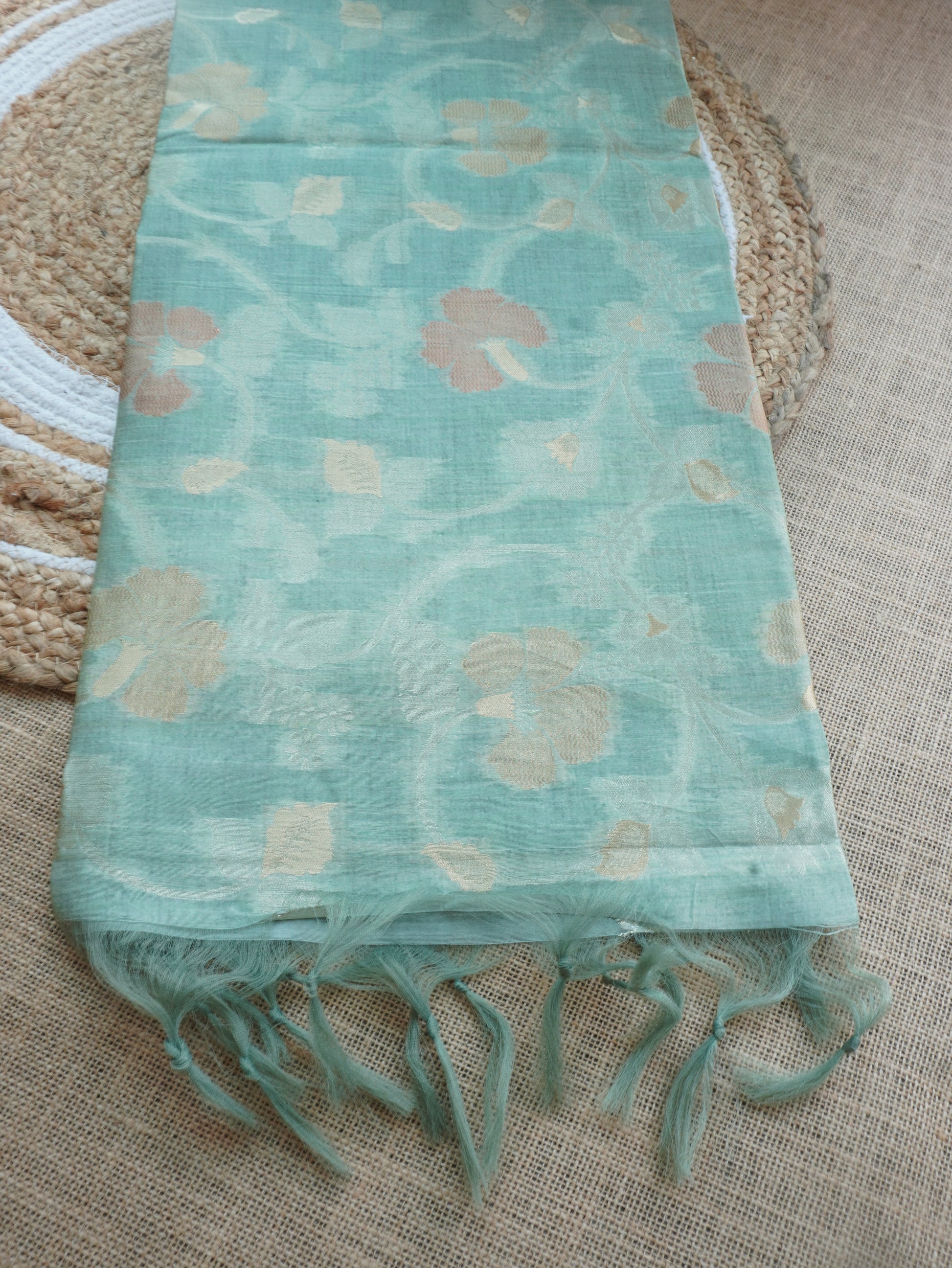 Crafted from luxurious tussar silk, this pastel green saree exudes timeless grace. The subtle hue beautifully complements the rich golden zari detailing, adding a touch of regal charm. Perfect for festive occasions, weddings, or elegant gatherings — a true blend of sophistication and tradition.