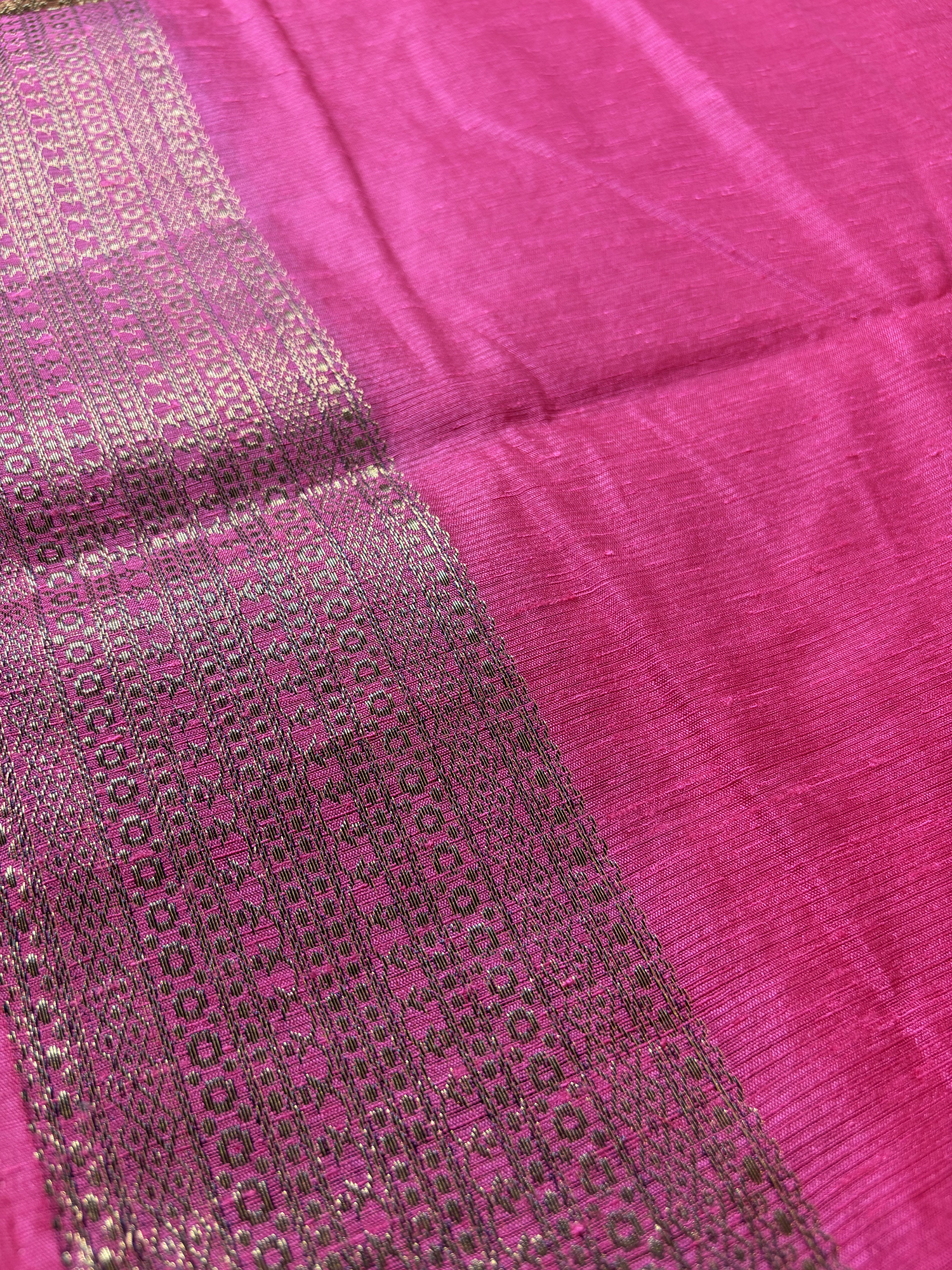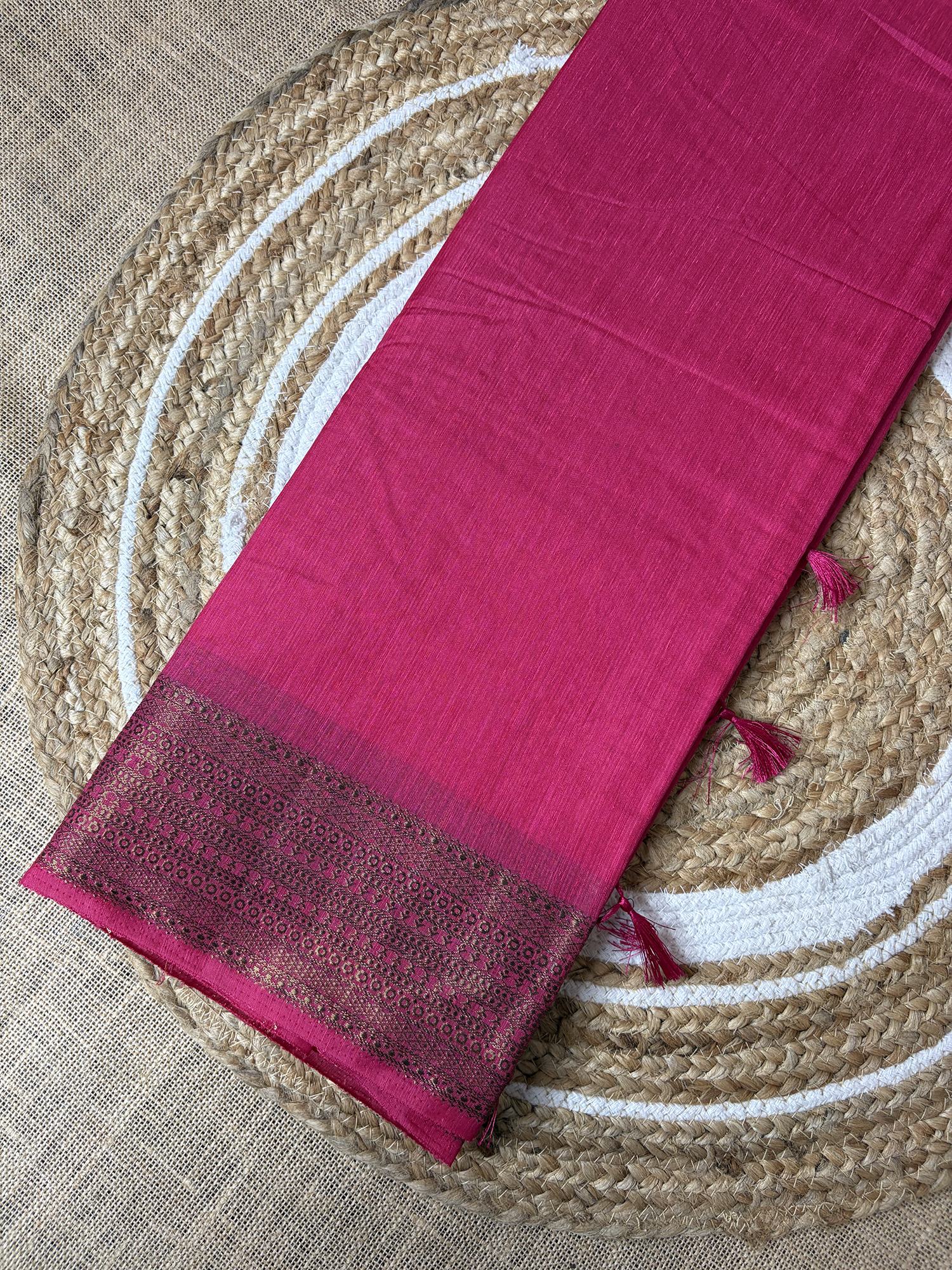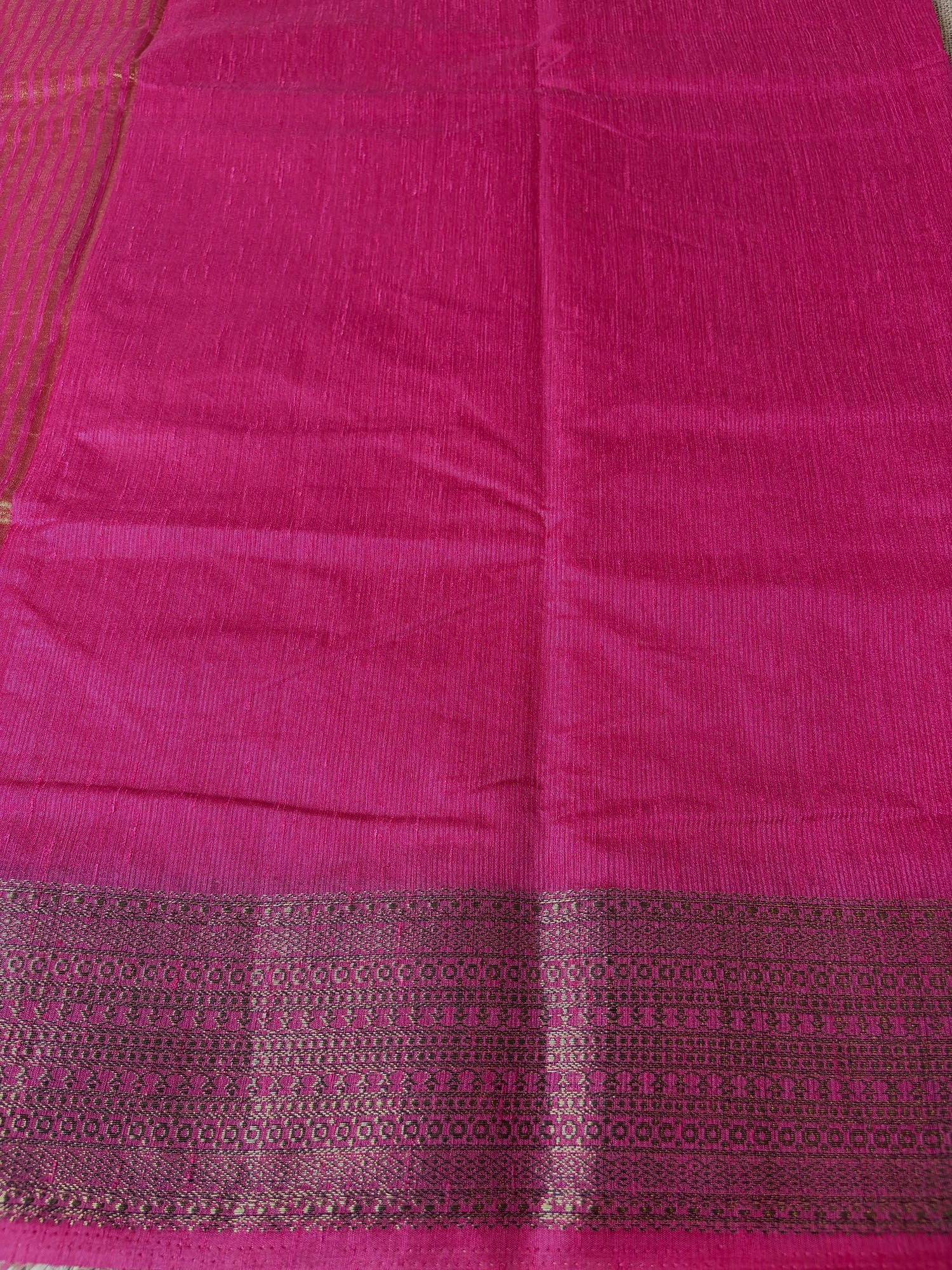 This stunning Rani pink semi jute silk saree showcases a vibrant, royal hue paired with a soft natural sheen that enhances its premium appeal. The lightweight semi jute silk fabric drapes beautifully, offering both comfort and elegance. Perfect for festive celebrations, weddings, and special occasions, this saree brings together traditional charm and bold sophistication. A timeless statement piece for those who love rich colours and graceful styling.